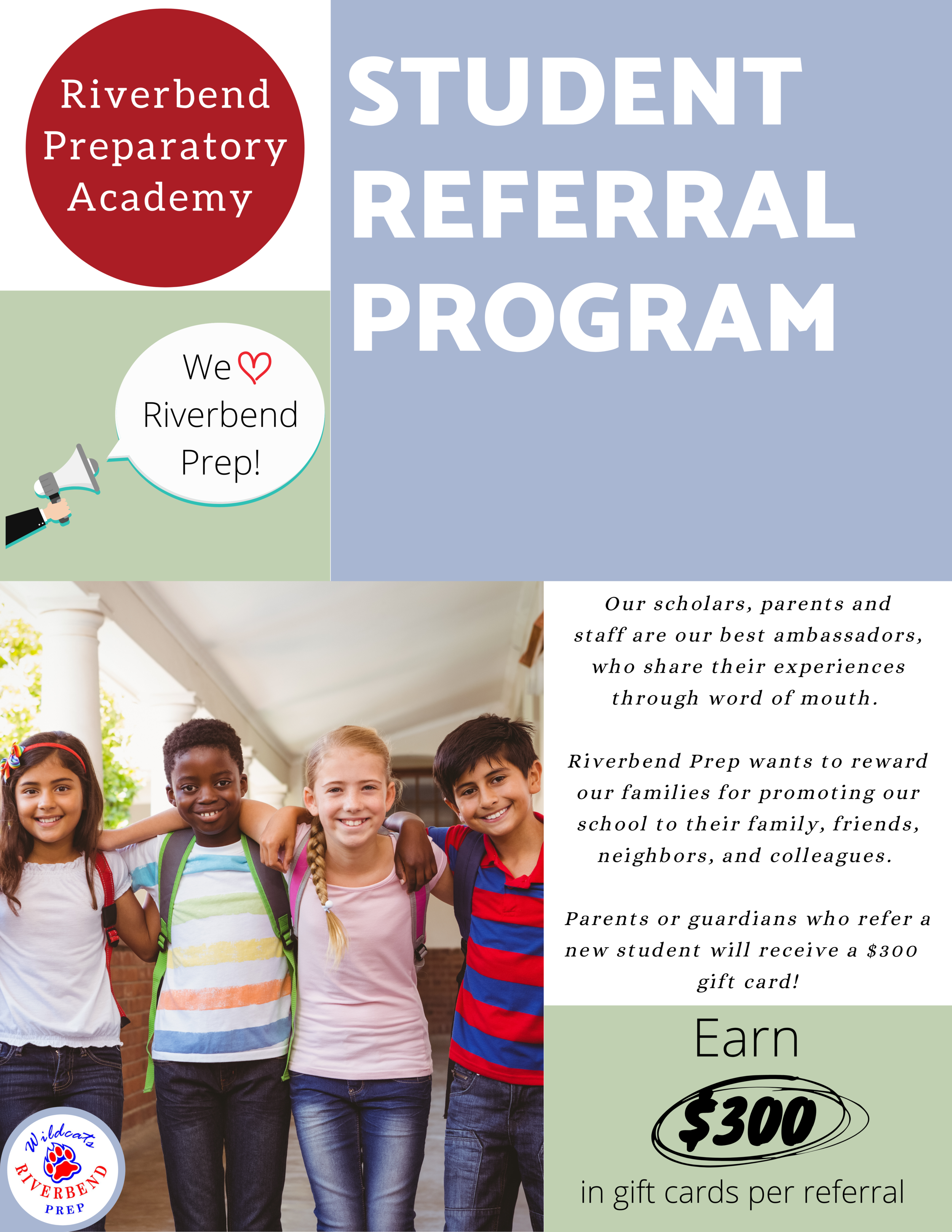 Our scholars, parents and saff are our best ambassadors, who share their experiences through word of mouth. Riverbend Prep wants to reward our families for promoting our school to their family, friends, neighbors, and colleagues. Parents or guardians who refer a new student will receive a $300 gift card!
